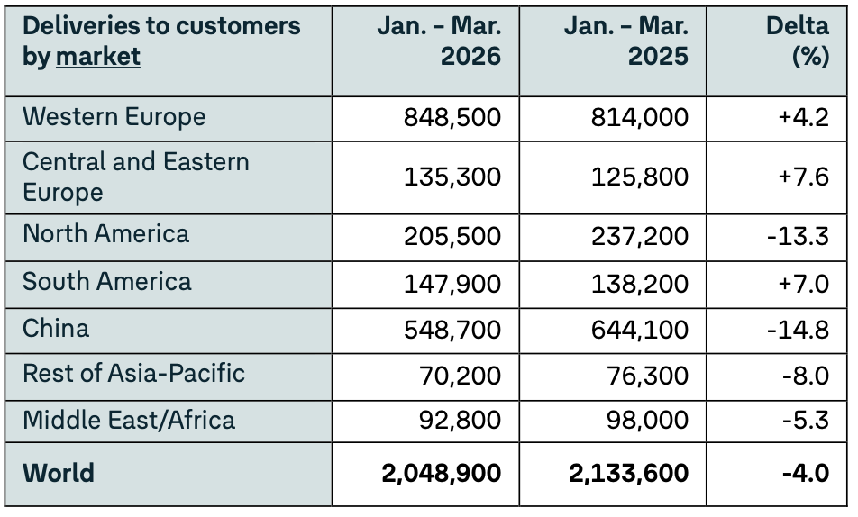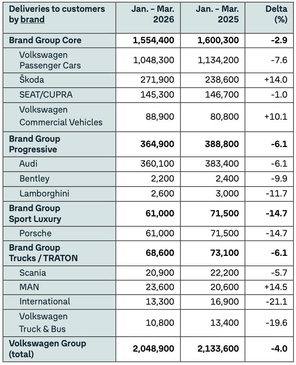 当地时间4月13日,大众汽车集团发布2026年第一季度交付数据。一季度,大众集团全球交付204.89万辆,2025年同期为213.36万辆,同比下降4%。
