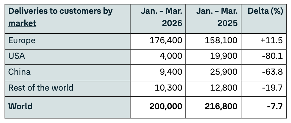 具体来看,一季度其全球纯电动车型交付20万辆,2025年同期为21.68万辆,同比下降7.7%。其中,欧洲市场纯电车型交付17.64万辆,同比增长11.5%,稳居欧洲纯电市场龙头地位,西欧地区纯电车型份额由19%提升至20%。